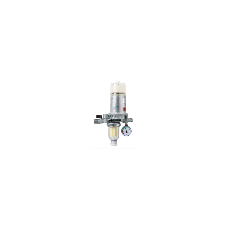 Purgeur mazout automatique avec filtre, robinet d’arrêt et vacuomètre intégrés. Idéal pour les systèmes monotube à recyclage. Boîtier en métal.